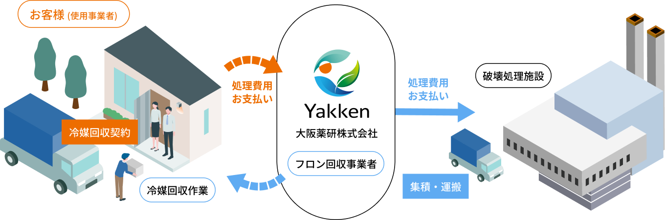 大阪薬研では、廃試薬・廃液の回収や収集運搬のほか、業務用冷蔵冷凍機器などの「第一種特定製品」に使用されるフロン類(冷媒)の回収および冷媒破壊作業の委託も承っております。